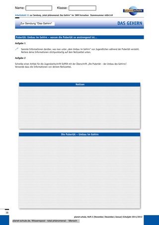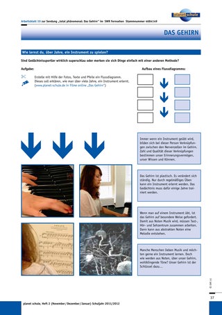 Durch die Sendung wird den Schülern auch deutlich, dass man das Gehirn dazu benötigt, um ein Instrument zu erlernen. Mithilfe des passenden Arbeitsblattes 10 „Wie lernst du, über Jahre, ein Instrument?“ erstellen die Schüler ein Flussdiagramm zum Thema. Während der Arbeit mit dem Arbeitsblatt 11 „Pubertät: Umbau im Gehirn – warum die Pubertät so anstrengend ist…“ finden die Schüler heraus, dass Jugendliche so anstrengend sind, weil ihr Gehirn während der Pubertät umgebaut wird. Zunächst sammeln sie Wissen zu diesem Thema in einer Partnerarbeit, um daraus dann einen Artikel für eine Jugendzeitschrift zu schreiben und so das erworbene Wissen zu festigen.