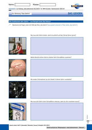 Im Film „Das Gehirn“ können die Schüler verfolgen, wie ein Gehirn – hier am Beispiel des Fahrradfahrens erklärt– funktioniert. Wichtige Stichpunkte zu diesem Thema notieren die Schüler, indem sie die Fragen zum Film auf dem Arbeitsblatt 2 „Wie funktioniert dein Gehirn – zum Beispiel beim Rad fahren?“ beantworten und dann ihre Ergebnisse miteinander vergleichen.