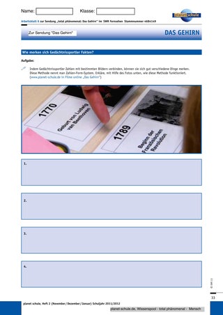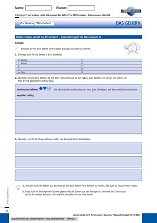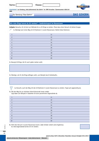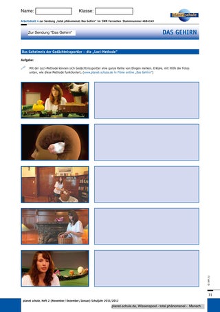 Gedächtnissportler verwenden verschiedene Methoden, um sich eine Abfolge von Gegenständen oder Fakten zu merken. Zwei dieser Methoden werden in dem Film „Das Gehirn“ vorgestellt. Nachdem die Schüler den Film gesehen haben, tragen sie auf dem Arbeitsblatt 4 „Das Geheimnis der Gedächtnissportler – die „Loci-Methode“ in einer Partnerarbeit ein, wie diese Methode funktioniert.