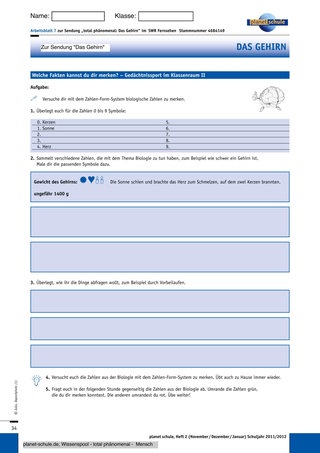 Mit Hilfe des Films füllen die Schüler auch das Arbeitsblatt 6 „Wie merken sich Gedächtnissportler Fakten?“ aus. Das Arbeitsblatt 7 „Welche Fakten kannst du dir merken?“ bietet den Schülern die Möglichkeit, an sich selbst auszuprobieren, wie sich Gedächtnissportler Fakten merken.
