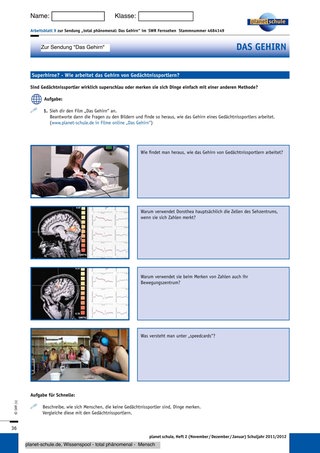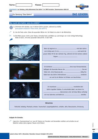 In der Sendung erfahren die Schüler, was in ihrem Gehirn passiert, wenn sie schlafen. Mit Hilfe des Lückentextes auf dem Arbeitsblatt 8 „Was macht dein Gehirn, wenn du schläfst?“ und Arbeitsblatt 9 „Superhirne? – Wie arbeitet das Gehirn von Gedächtnissportlern?“ fixieren die Schüler die Informationen aus dem Film.