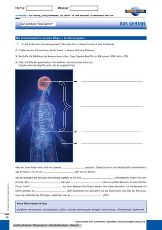 Um in das Thema einzusteigen, können die Schüler mit Schulbuch oder Internet in Partnerarbeit ihre Kenntnisse über das Nervensystem und dessen Funktion wiederholen und gegebenenfalls ergänzen. Ihre Ergebnisse können sie dann in das Arbeitsblatt 1 „Die Datenautobahn in unserem Körper – das Nervensystem“ eintragen. Bei der anschließenden Besprechung im Lehrer-Schüler-Gespräch wird das Arbeitsblatt als Folie verwendet.
