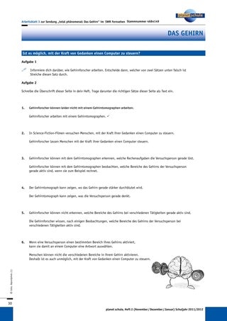 Ob es möglich ist, mit der Kraft von Gedanken einen Computer zu steuern, wird in dem Film „Das Gehirn“ gezeigt. Mit Hilfe des Arbeitsblatts 3 „Ist es möglich, mit der Kraft von Gedanken einen Computer zu steuern?“ verfassen die Schüler, möglichst in einer Partnerarbeit, einen Text zum Thema, den sie in ihr Biologieheft schreiben.
