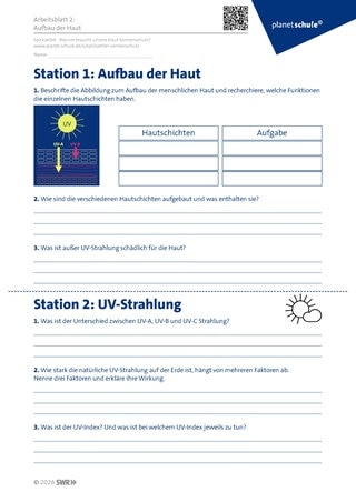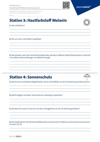 Die Schülerinnen und Schüler bearbeiten in Partner- oder Gruppenarbeit verschiedene Stationen zu den Themen UV-Strahlung, Aufbau der Haut, Melanin und Sonnenschutz: Arbeitsblatt 2 und Arbeitsblatt 3. Die Lösungen können eigenständig kontrolliert oder im Plenum besprochen werden.