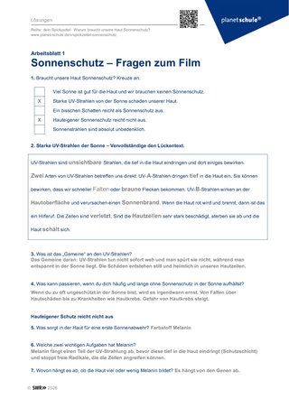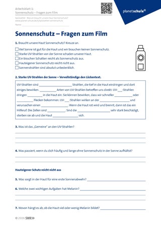 Der Film „Warum braucht unsere Haut Sonnenschutz?“ wird gemeinsam im Plenum angeschaut. Die Schülerinnen und Schüler erhalten Arbeitsblatt 1 mit Fragen zum Film, welches sie während des Schauens oder im Anschluss an den Film eigenständig bzw. in Partnerarbeit bearbeiten sollen. Die Lösungen werden gemeinsam besprochen.