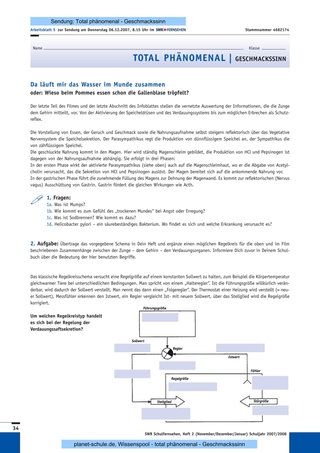 Hier bietet die Sendung die Möglichkeit, Information und Kommunikation in unserem Körper am Beispiel eines Regelkreisschemas zu bearbeiten. Das Schema beginnt beim Prüfen der Nahrung (Beschaffenheit, Geschmack), geht über Gehirn, Speichelproduktion, Verdauungssystem, Magensäure, Gallensaft und kann bis zum möglichen Erbrechen kombiniert werden.