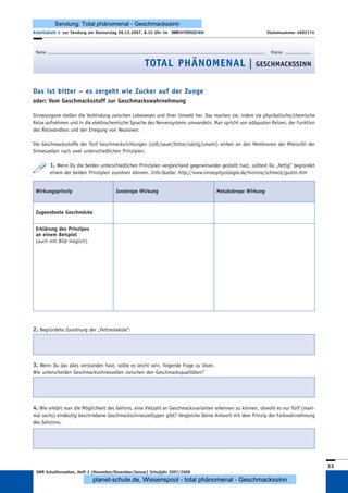 Die aktuellen Kompetenzen/Inhalte im Bildungsplan Baden-Württemberg 2004 für die Klassen 5 und 6 (Seite 205) bieten unter den Prinzipien der Angepasstheit und der Struktur/ Funktion geeignete Verknüpfungen für die Sendung. Angepasstheit von Lebewesen in Bau und Lebensweise: Denkbar wäre ausgehend von den im Film vorgestellten und begründeten unterschiedlichen Anzahlen an Sinneszellen auch die Angepasstheiten der Säugetiergebisse an die jeweilige Nahrung zu erarbeiten. Struktur und Funktion: Der Bau und die Funktion von Organen stehen im direkten Zusammenhang. Der Blick auf die Insekten bietet einen motivierenden Ansatz zum Vergleich der verschiedenen Geschmackssinne im Tierreich.