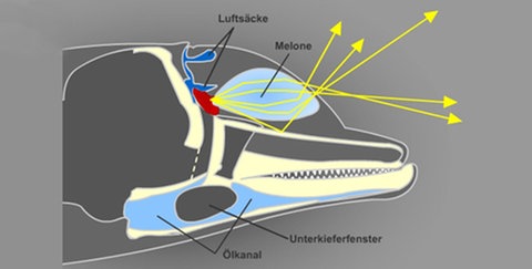 Die Laute, die zur Orientierung und zur Jagd benutzt werden, sind dagegen im Ultraschallbereich angesiedelt. Auch sie werden mit Hilfe der Luftsäcke produziert, von der darüber liegenden Schädeldecke nach vorn reflektiert und von der sogenannten Melone gebündelt. Bei der Melone handelt es sich um eine Aufwölbung über der Schnauze, die mit einer fettartigen Substanz gefüllt ist und die typische "Stirn" des Delfins bildet.