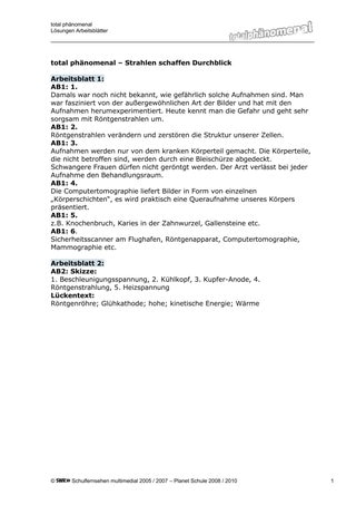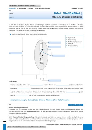 In der Oberstufe bietet es sich an, den Film vor der Unterrichtsreihe „Röntgenstrahlung“ als Motivation oder Einführung in das Themengebiet zu zeigen. Um jedoch diese spannenden Dinge verstehen und erklären zu können, ist etwas physikalisches Hintergrundwissen notwendig, wobei natürlich auch die Entstehung der Strahlung bzw. die Frage „Was ist Röntgenstrahlung überhaupt?“ geklärt werden muss. Die Erzeugung von Röntgenstrahlung, die im Film in einer Animation gezeigt wird, sollte zum Anlass genommen werden, sie im Unterricht noch einmal zu vertiefen. Dazu kann der Sachverhalt anhand von Arbeitsblatt 2 zusammengefasst werden. Anschließend bilden sich Expertenrunden, die sich mit den einzelnen (oben genannten) Anwendungsbereichen intensiver befassen. Als Informationsquelle für die bevorstehende Projektarbeit sind den Schülern das Internet, aber auch verschiedene Literatur aus der Schul- bzw. Stadtbücherei zugänglich. Auch Interviews mit den Herstellern sind denkbar. Angemerkt werden muss, dass verschiedene Anwendungsbereiche wie z. B. die Computertomographie aufgrund ihres Schwierigkeitsgrads eine Herausforderung für besonders leistungsstarke Schülergruppen darstellen. Die Unterrichtsreihe endet mit der Präsentation und Bereitstellung der Ergebnisse der einzelnen Projektgruppen, etwa in einer Präsentationsmappe oder in digitaler Form, zum Beispiel als Power- Point-Präsentation.