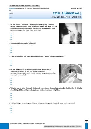 In der Mittelstufe ist ein Einsatz des Films im regulären Physikunterricht denkbar, aber auch im fächerübergreifenden Projektunterricht: Im Physikunterricht dieser Jahrgangsstufe sollte das Phänomen der Röntgenstrahlung allerdings nur phänomenologisch erfasst werden. Es lässt sich die Fragestellung nach den Einsatzgebieten und der Geschichte der Röntgenstrahlung beantworten, wobei der Film als Zusammenfassung oder als Vertiefung in das Themengebiet den Lernprozess unterstützen kann. Der Übergang zum fächerübergreifenden Projektunterricht (Fächer Religion, Geschichte, Gesellschaftskunde) ergibt sich hierbei fließend, denn auch die Vor- und Nachteile, die mit diesem Diagnoseinstrument verbunden sind, können erörtert werden, ebenso wie die Bedeutung für den einzelnen und für die Gesellschaft (siehe Arbeitsblatt 1). In dieser Jahrgangsstufe steht also viel mehr die Diskussion des gesellschaftlichen Bedürfnisses im Vordergrund. Auch die geschichtliche Entwicklung einer großartigen Entdeckung – mit den zunächst noch nicht erkannten tragischen Konsequenzen für den einzelnen damaligen Forscher, aber einer großen Bedeutung für unsere heutige Gesellschaft – kann reflektiert werden.