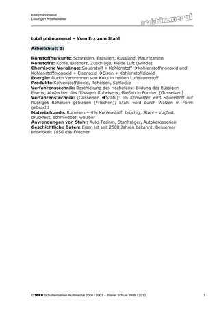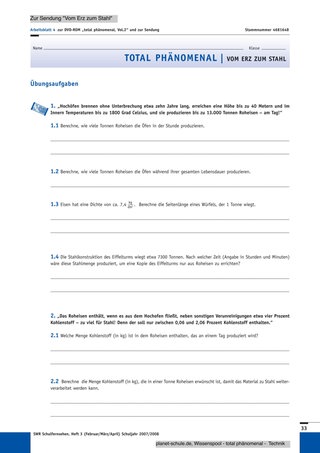Die jeweilige Überschrift (farbig unterlegt) wird im Lehrer-Schülergespräch bei der Besprechung der Sendung formuliert. Darunter stehen die Arbeitsaufträge für die Schülergruppen. Folgende Problematik bleibt: Gusseisen ist das Produkt des Hochofenprozesses. Ein brüchiger Werkstoff, dessen Eigenschaften mit den allgemein bekannten Eigenschaften von Stahl – im Volksmund meist einfach „Eisen“ genannt – nicht übereinstimmen. Die Sendung – noch zirka fünf Minuten – klärt auf.