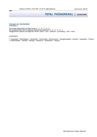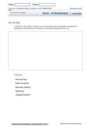 Die Überprüfung der Schüler-Spekulationen findet dabei im Grunde auf zweierlei Art statt. Die experimentelle Herangehensweise basiert auf der Eigenerfahrung im spielerischen Umgang mit den einfachen Saugnäpfen. Die letztendliche Erklärung erhält die Klasse durch den methodisch zielgerichteten Einsatz der Folge „total phänomenal – Saugstark“. Die Auswahl der beigefügten Materialien soll einen variantenreichen Einsatz ermöglichen: Das Arbeitsblatt „Prinzip Saugnapf“ ermöglicht, wie oben beschrieben, die Überprüfung der aufgestellten Vermutungen. Der reproduktiven Sicherung ausgewählter im Film vermittelter Tatsachen dient das Blatt „Saugnäpfe – einfach stark für Mensch und Tier“. Dagegen ist das Arbeitsblatt „Der neue Sauger“ eindeutig auf den kreativen Transfer gewonnener Erkenntnisse ausgerichtet. Die Phantasie von Schülerinnen und Schülern wird angeregt und mit neuem Wissen verknüpft.