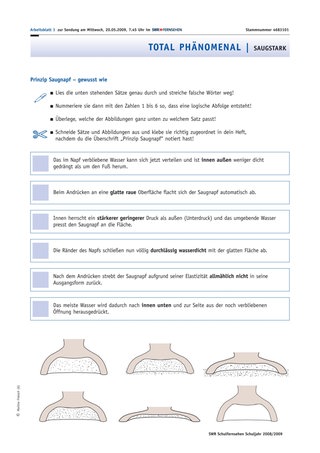 In der folgenden Unterrichtsphase wird erst das Arbeitsblatt „Prinzip Saugnapf“ verteilt und besprochen, dann die Sendung „total phänomenal – Saugstark“ gezeigt. Mithilfe des anschließend bearbeiteten und korrigierten Arbeitsblatts überprüfen die Schülerinnen und Schüler nun eigenständig ihre anfangs aufgestellten Hypothesen zur Funktionsweise von Saugnäpfen.