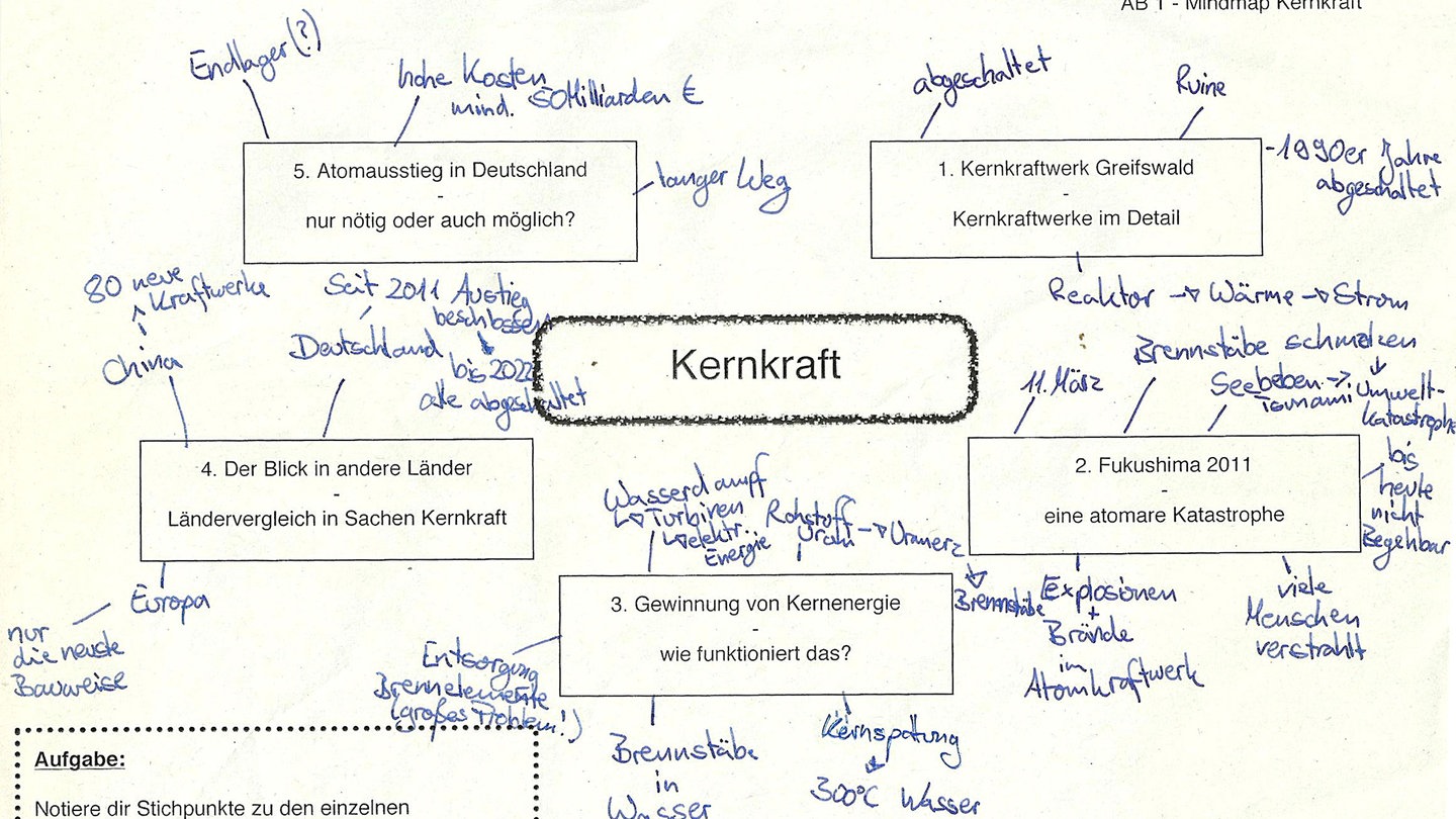 Zu Stundenbeginn dienten Bilder der atomaren Katastrophen von Fukushima und Tschernobyl als Gesprächseinstieg. Besonders die Atomkatastrophe von Fukushima war allen Schülern bekannt, weshalb sich schnell ein Gespräch darüber ergab. Die Impulse der Schüler wurden in einer Mindmap gesammelt und boten die Überleitung zum folgenden Film. Begleitend dazu notierten sich die Schüler auf Arbeitsblatt 1 Stichpunkte zu den im Film gezeigten Themen. (Die Arbeitsblätter befinden sich bei planet-schule.de im Wissenspool zur Sendung.)