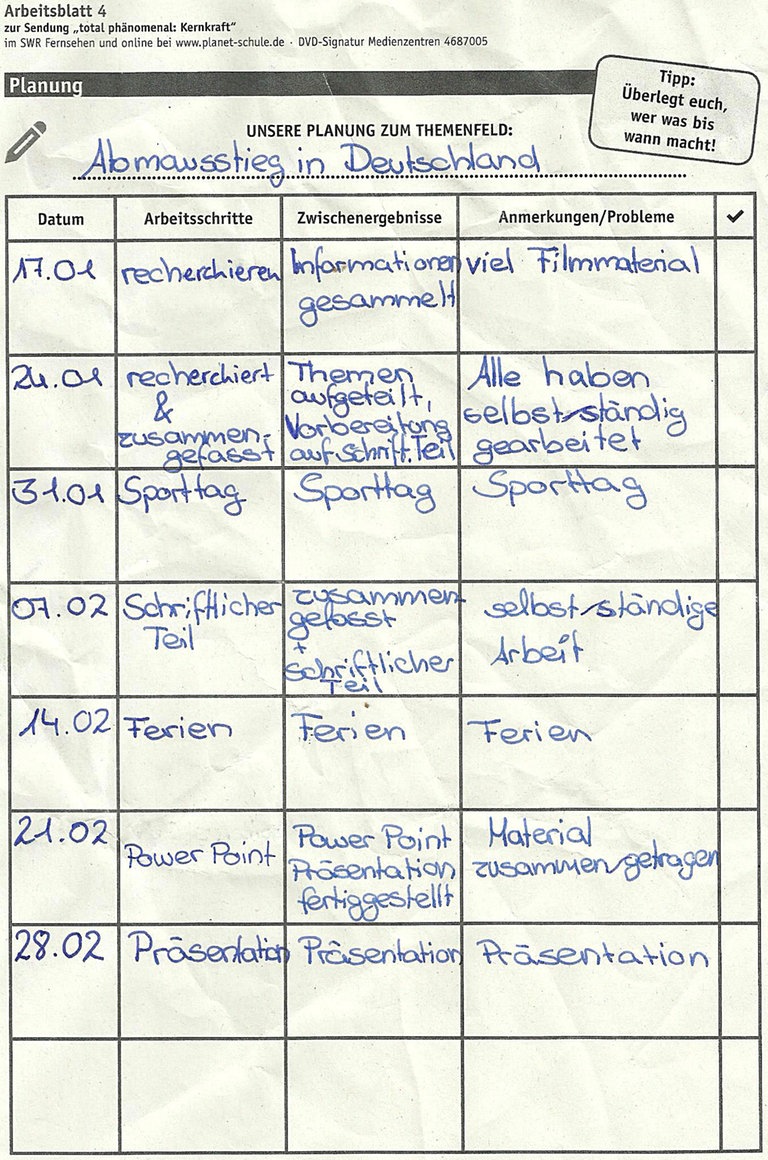 Nach Vergabe der Themen und Tipps wurden kurz das Vorgehen, der Ablauf und der Zeitraum, der auf fünf Wochen mit insgesamt zehn Physikstunden festgelegt war, besprochen: Innerhalb der Gruppe wählten die Schüler nun einen Gruppensprecher, der der Lehrperson jederzeit einen Ein- und Überblick zum jeweiligen Arbeitsstand geben konnte. Des Weiteren wurde die Wichtigkeit eines Arbeitsplanes thematisiert: Dieser sollte die Zeiteinteilung unterstützen und diente dazu, die Zwischenziele festzuhalten. (Bild 3) In der folgenden Arbeitsphase nutzten alle Gruppen die Internetrecherche. Bereitgestellte Schulbücher wurden vorerst nicht verwendet.