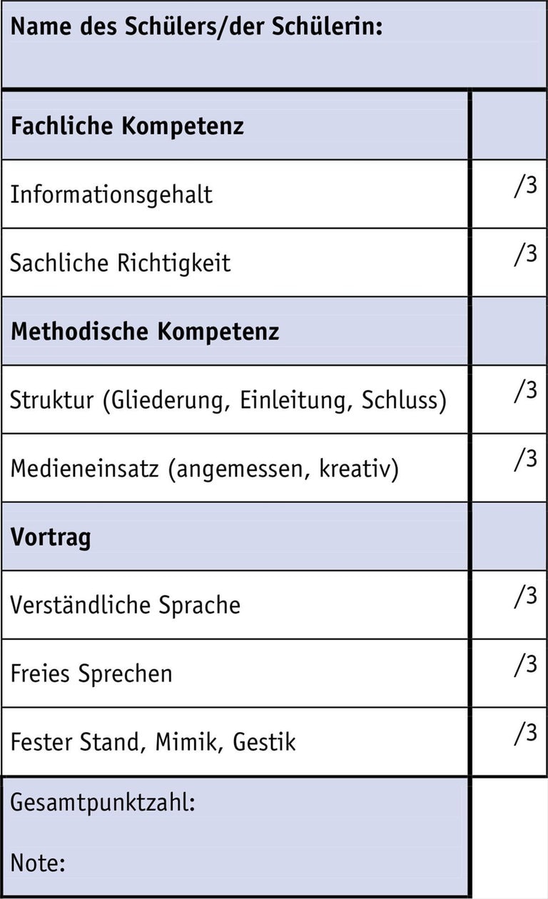 | Präsentation | Projekttag 5 (2 Stunden) | - Präsentation der einzelnen Gruppen - Bewertung der Präsentation durch die Lehrkraft | Einzelne Gruppenmitglieder fehlen: Der Vortragteil fehlender Schüler wird ausgelassen und fließt nicht in die Bewertung ein. Es werden Einzelnoten an jedes Mitglied der Gruppe vergeben. |