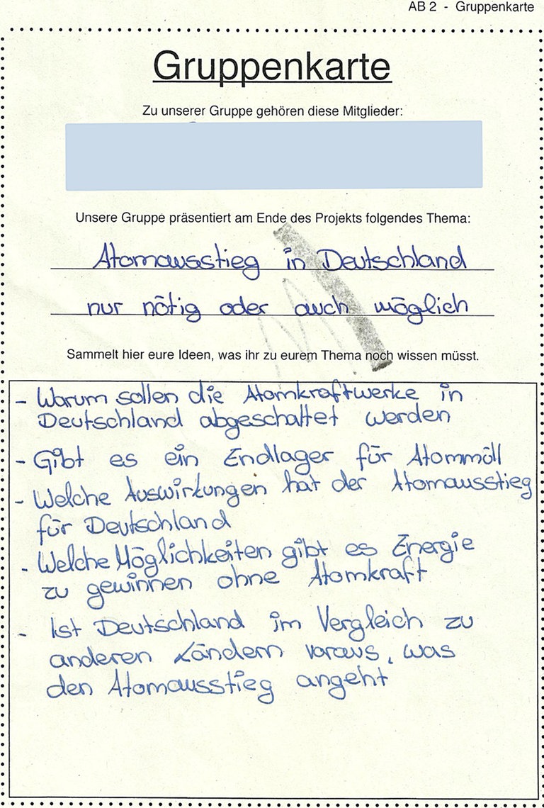 Nach dem Film wurden die Schüler informiert, dass die Themenbereiche des Films als Projektthemen dienen, worauf die Schüler sogleich begannen, ihre Gruppen zu finden und Wunschthemen auszuwählen. Die Gruppenstärke betrug hierbei fünf bis sechs Schüler. Da mehrere Gruppen ein bestimmtes Thema erarbeiten wollten, entschied am Ende das Los. Besonderer Beliebtheit erfreute sich das Thema „Fukushima“ – wohl wegen vorhandenen Vorwissens. Weniger beliebt war das Thema „Gewinnung von Kernenergie“. Die Ansage, dass das Projekt mit einer Präsentation und Ausarbeitung enden und dieses als Klassenarbeit zählen würde, motivierte die Schüler ganz besonders. (Bild 2)