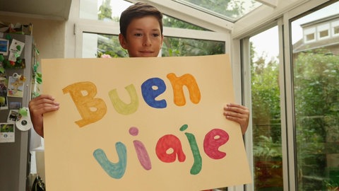 Mia schickt Gabriel Videos, in denen sie sich und ihre Familie in Madrid auf Spanisch vorstellt. Auch eine Tour durch die Wohnung gehört dazu.