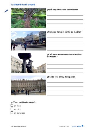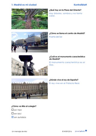 Die Schülerinnen und Schüler tauschen sich zunächst zu Madrid aus. Warum gefällt ihnen die Stadt? Was finden sie am schönsten? Was würden sie gern besuchen? Gegebenenfalls können sie das Gespräch auf ihren Wohnort erweitern: Welche Sehenswürdigkeiten aus der eigenen Umgebung würden sie gern Mia zeigen?