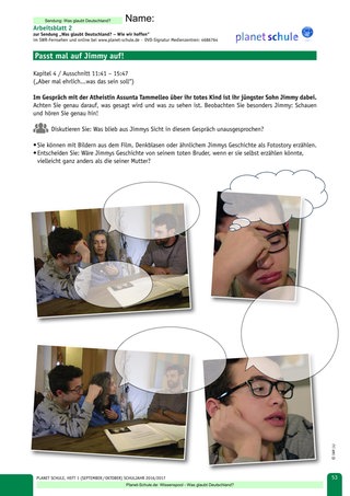 I. „Passt mal auf Jimmy auf!" (Arbeitsblatt 2) stärkt medienkritisch-analytische Fähigkeiten und solche des Einfühlungsvermögens. Es bedarf bei der nochmaligen Ausschnittsichtung eventuell auch vorheriger Aufmerksamkeitslenkung durch die Lehrkraft.