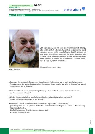 III. „Gott rettet alle“ (Arbeitsblatt 4) thematisiert die sogenannte „Allversöhnung“, mit der Albert Biesinger durchaus im Trend aufgeschlossener Theologie liegt. Das wirkt den Klischees von Himmel und Hölle im Christentum entgegen, an denen der Reporter offensichtlich gerne festhält. Doch bleibt die seit Origenes († 253) diskutierte Auffassung in konservativen Kreisen unter Häresie-Verdacht und löst auch nicht alle theologisch-fachlichen Probleme.