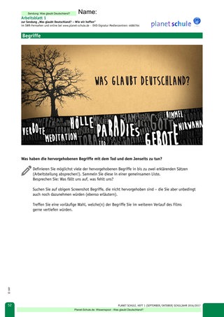 a. nur der Intro-Trailer gezeigt, der in leichter Abwandlung bei allen drei Folgen zu finden ist. Er gibt den Einstieg über Begriffe vor, die nach der grafischen Anmutung gleichsam den wurzelverwobenen Untergrund darstellen, aus dem die Auseinandersetzung mit der Religion erwächst (Baum, Spaziergang!) (Arbeitsblatt 1). Deshalb wird auch empfohlen, bei den thematisch anders gelagerten beiden folgenden Sendungen („Wie wir lieben“, „Wie wir feiern“) mittels Screenshot ein ähnliches Arbeitsblatt vorzubereiten und entsprechend zu verfahren.