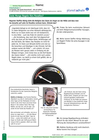 II. „Jede Menge Regeln fürs Paradies?" (Arbeitsblatt 3) aktiviert in besonderer Weise Kompetenzen des interreligiösen Dialogs. Authentische Auskünfte aus dem Islam können dem Eindruck entgegenwirken, muslimischer Glaube sei aus Angst vor Höllenstrafen oder aus Berechnung auf himmlische Belohnung motiviert.