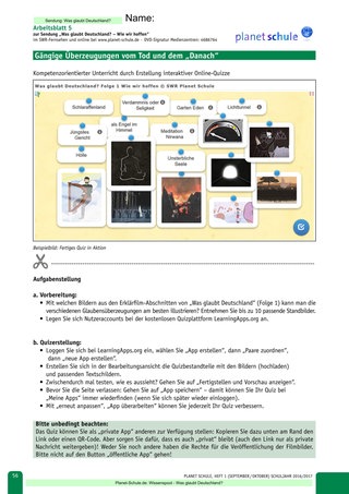 | Hausaufgabe: digital Bilddateien (Screenshots) aus dem Film erzeugen, die verschiedene Überzeugungen zum Tod / das „Danach“ in den Religionen organisieren helfen. | HA: Bilder auf USB-Stick mitbringen, ggf. arbeitsteilig organisieren. Ggf. schon persönliche Registrierung auf der Plattform LearningApps erledigen, Anmeldedaten mitbringen | ||