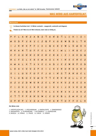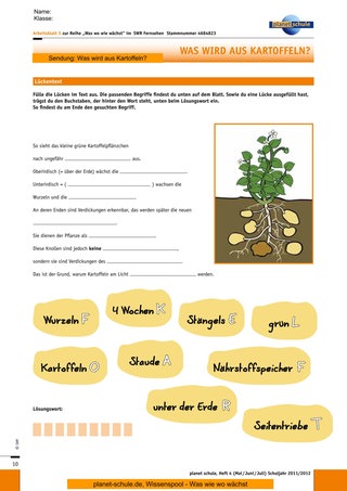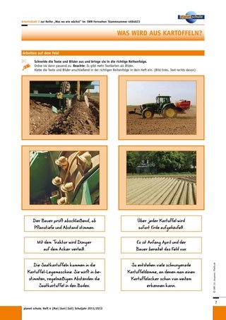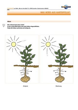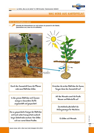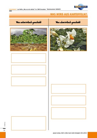 Das Arbeitsblatt 6 „Wie die Kartoffelpflanze wächst“ ist anspruchsvoller, da ein Transfer erforderlich wird. Die Einordnung der Sachinformationen zu „oberirdisch“ und „unterirdisch“ bedarf zusätzlich noch der Einhaltung der korrekten zeitlichen Reihenfolge. Durch Verwendung beziehungsweise Nicht-Verwendung des Leerblattes wird leistungsdifferenziert.