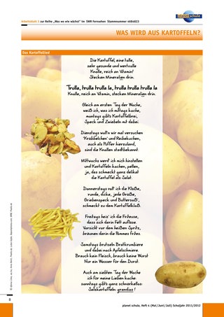- Das Kartoffellied (Melodie „Auf der schwäb’schen Eisenbahn“) – selbst gedichtet (Arbeitsblatt 3)