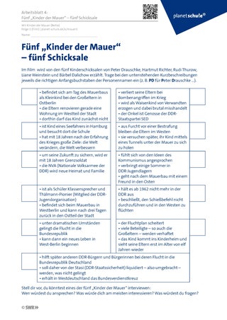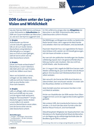 Die Lehrkraft leitet nun mittels eines kleinen Vortrags zum Film über. Zur inhaltlichen Arbeit stehen zwei Arbeitsblätter zur Verfügung (AB 3 und AB 4). Ein Arbeitsblatt wagt eine Gegenüberstellung der angestrebten sozialistischen Vision, wie sie im Text der DDR-Hymne zu finden ist, mit der Alltagsrealität der Menschen in Ostdeutschland, wie sie im Film gezeigt wird (Arbeitsblatt 3). Das andere Arbeitsblatt befasst sich direkt mit den fünf Lebensgeschichten, die die Grundlage der filmischen Erzählung bilden (Arbeitsblatt 4).