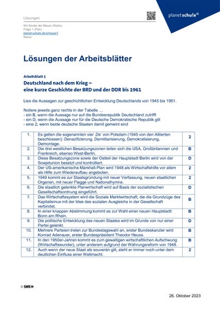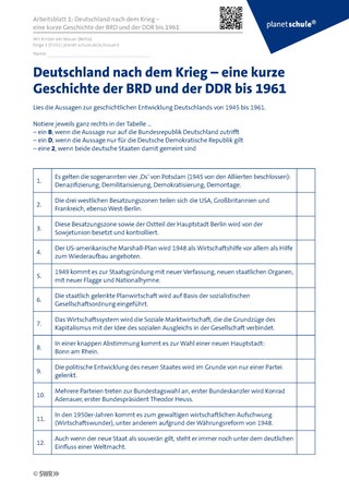 Am Beginn der Doppelstunde wiederholt die Klasse die historischen Ereignisse in Deutschland zwischen 1945 und 1961 im Quiz. Dieses kann in Form eines Arbeitsblattes (Arbeitsblatt 1) zunächst als Einzelarbeit ausgegeben, bearbeitet und dann kontrolliert werden. Denkbar ist auch dessen gemeinsame Bearbeitung mit der Klasse im Plenum oder – nach Umarbeitung des Arbeitsblattes in eine PowerPoint – als zentrale Präsentation.