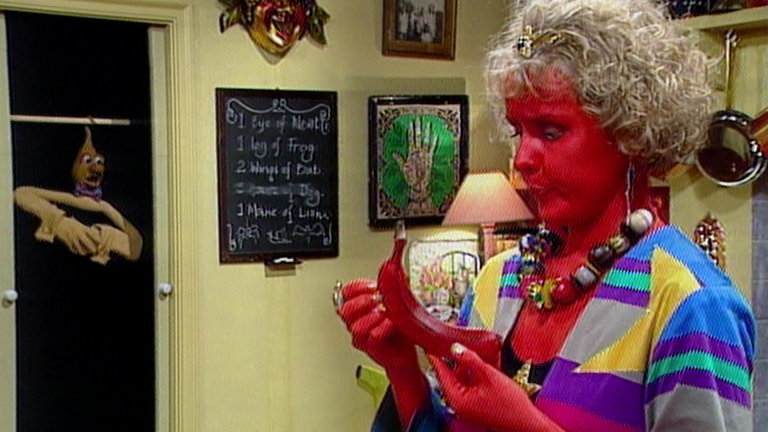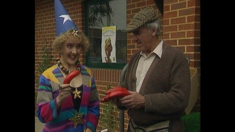 Für ein nicht näher erläutertes Zauberkunststück benötigt Wizadora eine rote Banane. Nichts liegt näher, als eine normale Banane in eine rote Banane zu verwandeln. Aber das klappt nicht. Hier hat der weise Very Old Fish eine scheinbar praktische Idee: „Wizadora! Go to a shop“. Ab geht’s per Zauberspruch zum skeptischen Gemüsehändler Sid. Eine rote Banane? Er bietet rote Äpfel, Erdbeeren und Kirschen an, aber eine rote Banane? „Look. No red banana“, sagt er abschließend.