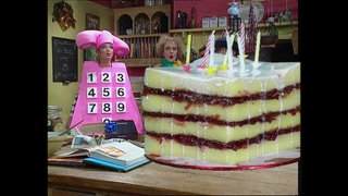 Schließlich stellt sich heraus, dass die Freunde eine große Überraschung geplant haben: Da sind die Geburtstagsballons, die sandwiches, die crisps und die ice lollies – alles, was zu einer guten englischen Geburtstags-Überraschungsparty gehört. Nur die Drawer People, die frechen Socken, haben natürlich kein Geschenk für Wizadora. Bei so viel Geburtstagsturbulenz scheint plötzlich der Geburtstagskuchen doch zu klein: Nun ist die Zauberin wieder gefordert – sie versucht, den kleinen Kuchen groß zu zaubern, doch der explodiert... und klebt überall in der Hexenküche.