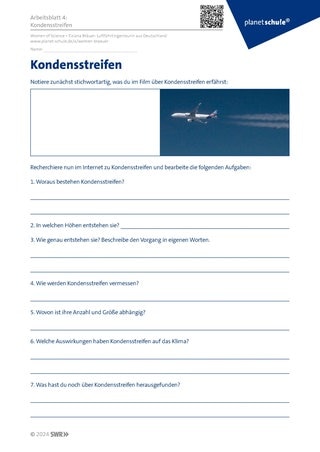 Auf Arbeitsblatt 4 befassen sich die Schüler:innen mit dem Thema Kondensstreifen, einem wichtigen Teilbereich von Tizianas Berufsleben. Die Wirkung des Luftverkehrs auf das Klima und Klimaschutz sind die Themen, die auf Arbeitsblatt 5 vertieft werden.