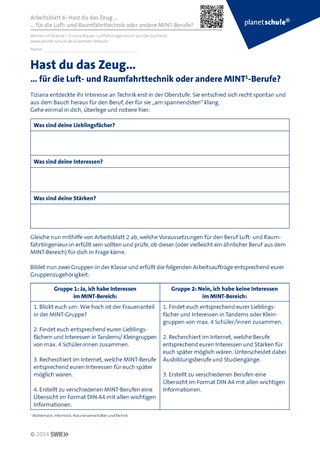 Anhand von Arbeitsblatt 6 werden sich die Schüler:innen ihrer eigenen Interessen und Stärken bewusst und recherchieren in Kleingruppen verschiedene Berufe. Die Arbeitsergebnisse aller Kleingruppen werden gedruckt und können im Klassenzimmer z.B. an zwei parallelen Wäscheleinen („Kondensstreifen“) aufgehängt und so für alle frei zugänglich gemacht werden.