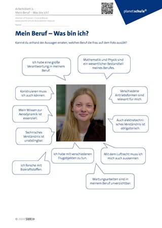 Betrachten des Fotos (Arbeitsblatt 1) von Tiziana Bräuer im Plenum, verbunden mit der Frage, welchen Beruf diese Frau wohl haben könnte. Die Schüler:innen äußern ihre Vermutungen. Sollten sie „typische Frauenberufe“ nennen, kann die Lehrkraft nachhaken, woran sie ihre Vermutungen festmachen und so bereits thematisieren, dass es Geschlechterstereotype bezüglich Berufen gibt. Mit dem Hinweis, dass diese Frau keinen „typischen Frauenberuf“ ausübt, wird das Arbeitsblatt 1 ausgeteilt oder für alle sichtbar projiziert. Die Schüler:innen sollen anhand der Aussagen erneut raten, welchen Beruf sie ausübt. Sollte die Klasse nicht auf den Beruf der Luftfahrtingenieurin kommen, löst die Lehrkraft das Rätsel auf.