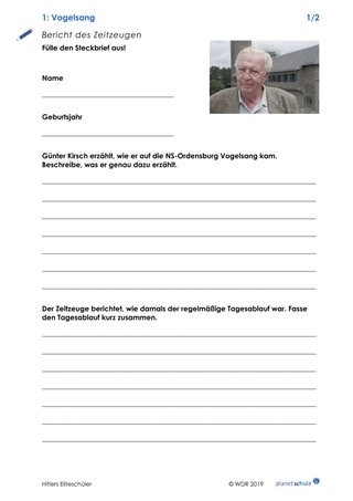 In dieser Phase beschäftigen sich die Schülerinnen und Schüler mit der Perspektive des Zeitzeugen Günter Kirsch, der als „Adolf-Hitler-Schüler“ die NS-Ordensburg Vogelsang ab dem Jahr 1938 besuchte. Sie erstellen einen Steckbrief und verarbeiten dabei die im Film von Günter Kirsch geschilderten Erinnerungen. Sie fassen seine Geschichte in Abschnitten zusammen und setzen sich damit auseinander, wie sich der Junge gefühlt hat.