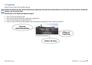 Die Schülerinnen und Schüler recherchieren die Geschichte der NS-Ordensburg Vogelsang und erstellen mithilfe des Arbeitsblattes eine Mindmap dazu. Mithilfe der Mindmap erarbeiten sie die Themenbereiche „Aufbau der Burg“, „Alltag auf Vogelsang“ und „Ziele der Nationalsozialisten“. Bei der Erarbeitung können sie Informationen aus Erarbeitung 1 und dem Film nutzen, aber auch aus dem Internet. Passende Internetquellen sind unter „Links und Literatur“ in diesem Wissenspool zu finden.