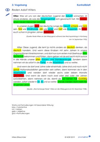 Bei der Analyse der Hitler-Reden macht es Sinn, den ersten Redeauszug (aus Hitlers Rede an die Hitlerjugend während des Reichsparteitags in Nürnberg am 14. September 1935) als einen Block sowie die folgenden Redeauszüge (aus der „Reichenberger Rede“ Hitlers an die Hitlerjugend am 2. Dezember 1938) als einen Block zu betrachten (siehe Quellentexte auf Arbeitsblatt 3). Als Transfer verfassen die Schülerinnen und Schüler eine Gegenrede zu Hitlers Redeauszügen, in der sie sich dazu äußern, wie Jugendliche aus ihrer Sicht heute erzogen werden sollten.