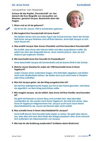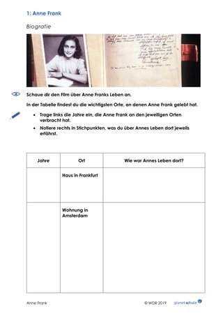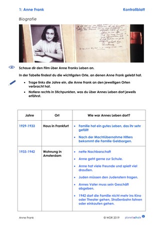 Die Schülerinnen und Schüler schauen den Film in Einzelarbeit an. Sie notieren Anne Franks Erlebnisse stichpunktartig und ordnen sie den jeweiligen Wohnorten und Zeiträumen zu. Sobald sie mit der Bearbeitung fertig sind, finden sich die Schülerinnen und Schüler mit einem Arbeitspartner oder einer Arbeitspartnerin zusammen. Die Paare vergleichen ihre Ergebnisse und ergänzen Fehlendes. Abschließend können die Ergebnisse noch im Plenum besprochen oder von den Schülerinnen und Schülern selbstständig mit Hilfe des Kontrollblatts überprüft werden.