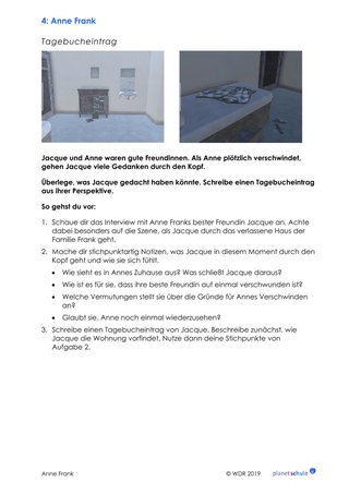 Zunächst geht es dabei um die Sicht von Jacque. Die Schülerinnen und Schüler schauen sich das AR-Video „Die Freundschaft“ an und achten dabei besonders auf die Szene, als Jacque durch das verlassene Haus der Familie Frank geht. Diese Szene wird zum Anlass genommen, um einen Tagebucheintrag aus der Sicht von Jacque zu schreiben.