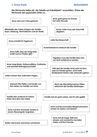Für schwächere Schülerinnen und Schüler gibt es ein Materialblatt mit fertigen Stichpunkten, die sie den einzelnen Phasen aus Anne Franks Leben auf Arbeitsblatt 1 zuordnen. Dort können sie die Stichpunkte entweder an die passende Stelle schreiben oder die Stichpunkte des Materialblatts ausschneiden, an die passende Stelle in der Tabelle legen und nach der Kontrolle dort einkleben.