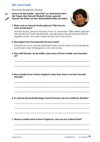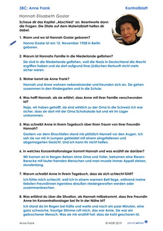 Für leistungsschwächere Schülerinnen und Schüler gibt es zu jeder Protagonistin ein vereinfachtes Arbeitsblatt (2BC bzw. 3BC), das sich allein mit den Erzählungen lösen lässt. Die Inhalte, die die anderen Schülerinnen und Schüler aus den Kurzbiografien entnehmen sollen, sind hier bereits abgedruckt. Um die Fragen leichter beantworten zu können, erhalten diese Schülerinnen und Schüler unterstützend Materialblätter, auf denen die Zitate der Zeitzeuginnen und von Anne Frank aus den beiden Kapiteln abgedruckt sind.