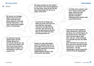 Die Materialblätter liegen in zwei Varianten vor. In der B-Variante sind die Zitate von Anne Frank und von der jeweiligen Protagonistin gemischt und müssen zunächst verstanden und der passenden Person inhaltlich zugeordnet werden, bevor die Schülerinnen und Schüler mit ihrer Hilfe die Fragen beantworten. In der C-Variante sind die Zitate Anne Frank und der jeweiligen Freundin bereits zugeordnet.