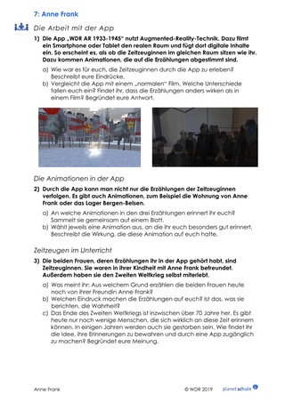 Besonders wenn das Tagebuch noch nicht komplett gelesen wurde, bietet es sich an, mit der Klasse zunächst mit dem Film „Anne Franks Leben“ zu arbeiten, der innerhalb der App abgerufen werden kann. Er zeichnet mit historischen Fotos und Filmaufnahmen Anne Franks Biografie nach. Im Gegensatz zu den beiden Erzählungen der Freundinnen nutzt er keine Augmented-Reality-Technik, sondern ist klassisch linear erzählt. Die Klasse erhält mit Hilfe des Films einen guten Überblick über Annes Biografie, auch über die Jahre hinaus, in denen sie Tagebuch schrieb.