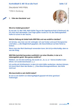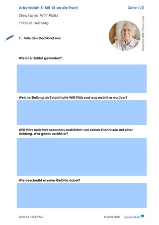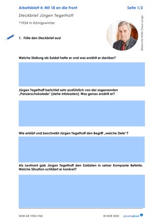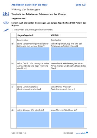 Anschließend bilden sie Arbeitspaare und einigen sich darauf, wer sich mit welcher Erzählung genauer befasst. Gemeinsam sehen sie sich die Erzählungen der ehemaligen Soldaten Jürgen Tegethoff und Willi Plätz an und füllen die Tabelle auf Arbeitsblatt 3 aus. Sie notieren jeweils zu einem der beiden Protagonisten ihren ersten Eindruck von Gestik, Mimik, Stimme sowie die zusätzlichen Animationen, die ihnen besonders im Kopf geblieben sind und vergleichen die Wirkung der beiden Zeitzeugen.