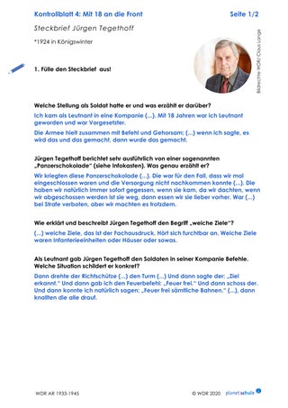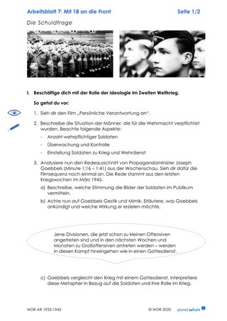 Die Schülerinnen und Schüler schauen den Film und machen sich anhand von Aufgabe 1 auf Arbeitsblatt 7 erste Notizen zu Zwang und Überwachung im Zweiten Weltkrieg. Anschließend befassen sie sich mit der Bedeutung der Ideologie für die Beurteilung der Schuldfrage. Dazu schauen sie sich die Rede von Propaganda-Minister Joseph Goebbels (Minute 1:16-1:41) an, achten zunächst auf die Reaktionen der Soldaten und analysieren anschließend Inhalt sowie Inszenierung der Rede durch Goebbels.