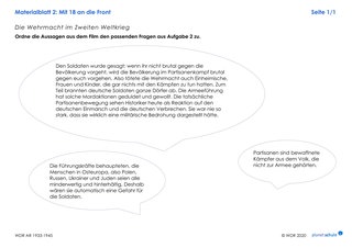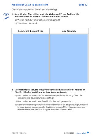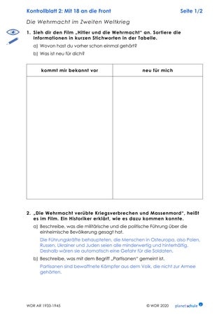 Die Schülerinnen und Schüler notieren in der Tabelle auf Arbeitsblatt 2, welche der im Film genannten Informationen ihnen bekannt vorkommen und was neu für sie ist. Die Ergebnisse werden im Plenum besprochen und ergänzen die Mindmap. Anschließend setzen sich die Schülerinnen und Schüler mithilfe von Aufgabe 2 mit Kriegsverbrechen und Massenmord seitens der Wehrmacht auseinander.