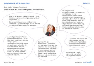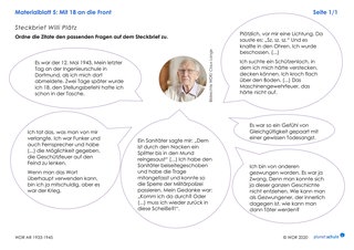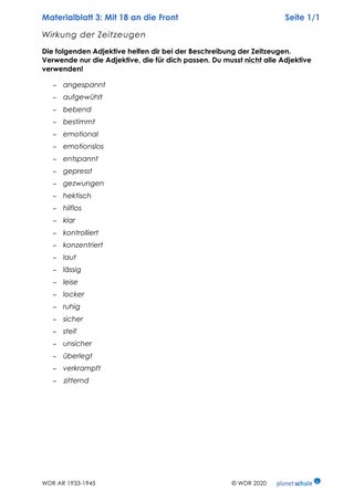 Materialblatt 3 gibt als Hilfestellung mögliche Adjektive zur Beschreibung der Zeitzeugen vor. Auf den Materialblättern 4 und 5 finden die Schülerinnen und Schüler die passenden Zitate für den Steckbrief. Diese müssen den Fragen zugeordnet werden.